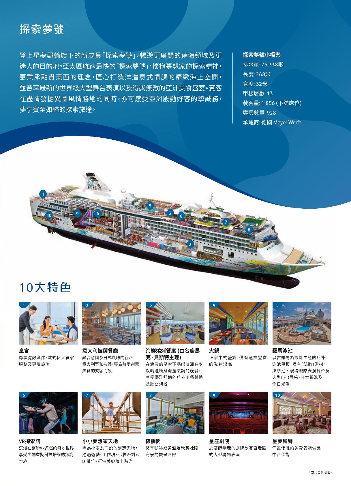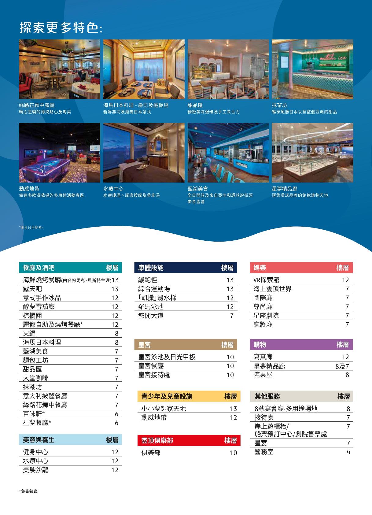 ★本行程表內所介紹之各項設施僅供參考,若郵輪上增加或關閉各項設施請恕不另行通知,均依登船後星夢每日所提供之"星夢日報"為準。