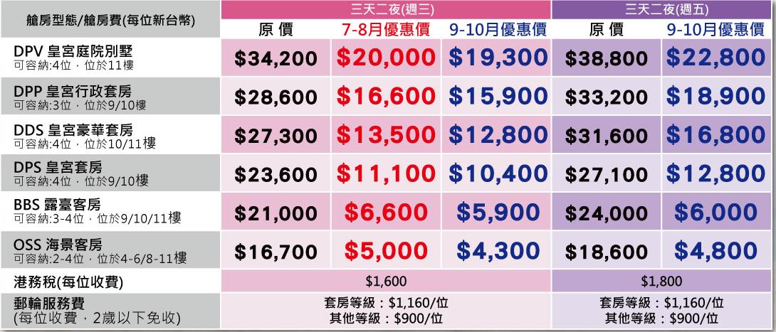 ■艙房價格及所有優惠方案以新台幣收費,僅適用於持中華民國護照者。