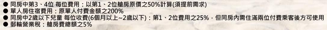 •郵輪服務費:外、露臺艙/每人每晚NT$450、套房/每人每晚NT$580(於船上支付)。