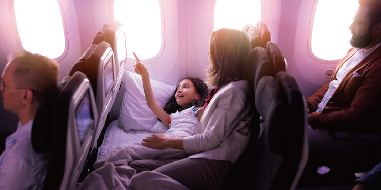 Skycouch指由經濟艙一排內的三個座位組合而成,創造專屬於你的空間,讓你放鬆、伸展,或讓小孩玩樂。這就像在機艙內擁有自己的獨立空間。 該座位與經濟艙座位相同,但設有額外腳踏。你可以升起一半用作腳凳,或是完全升起創造一個大沙發空間。