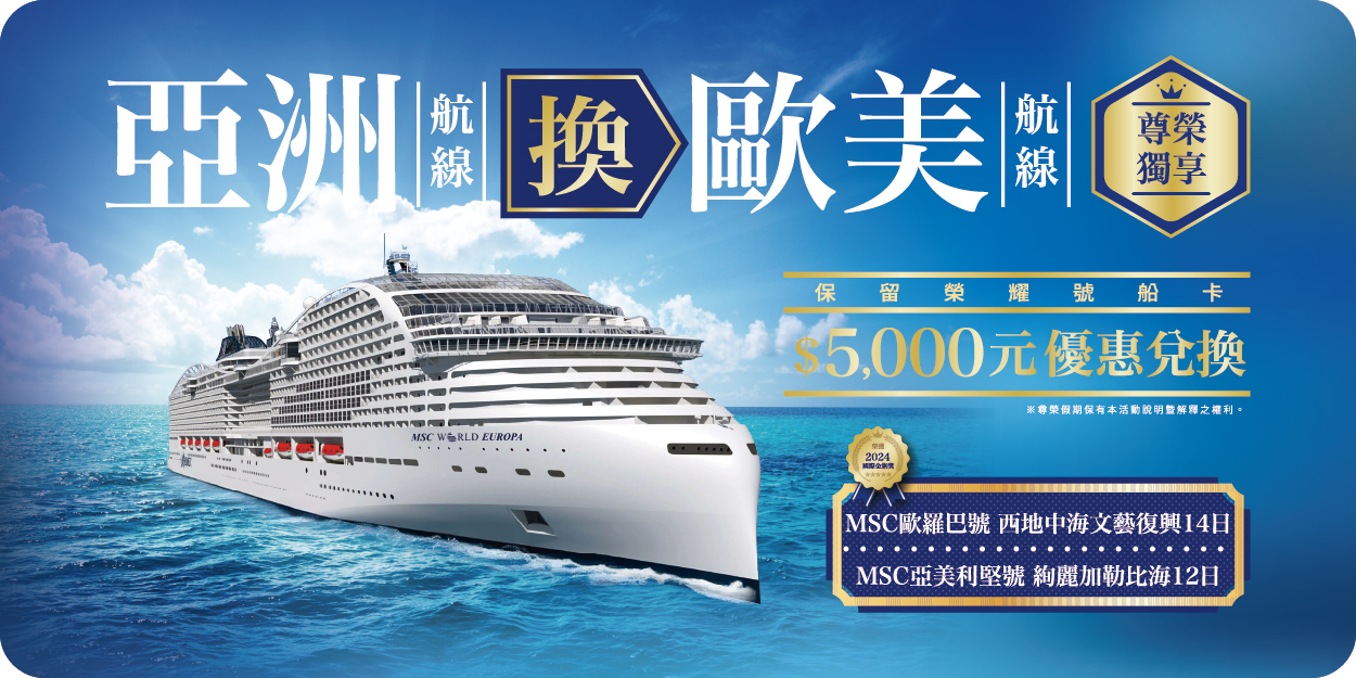 保留榮耀號船卡,即享歐美郵輪$5000元優惠兌換!