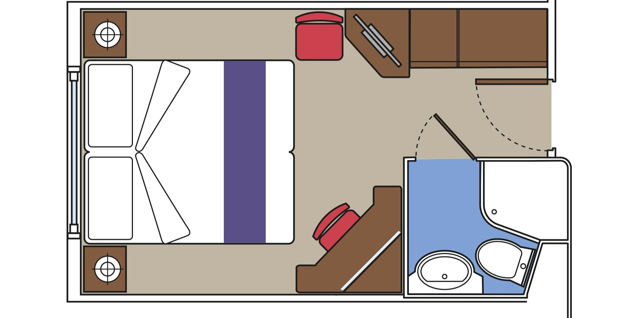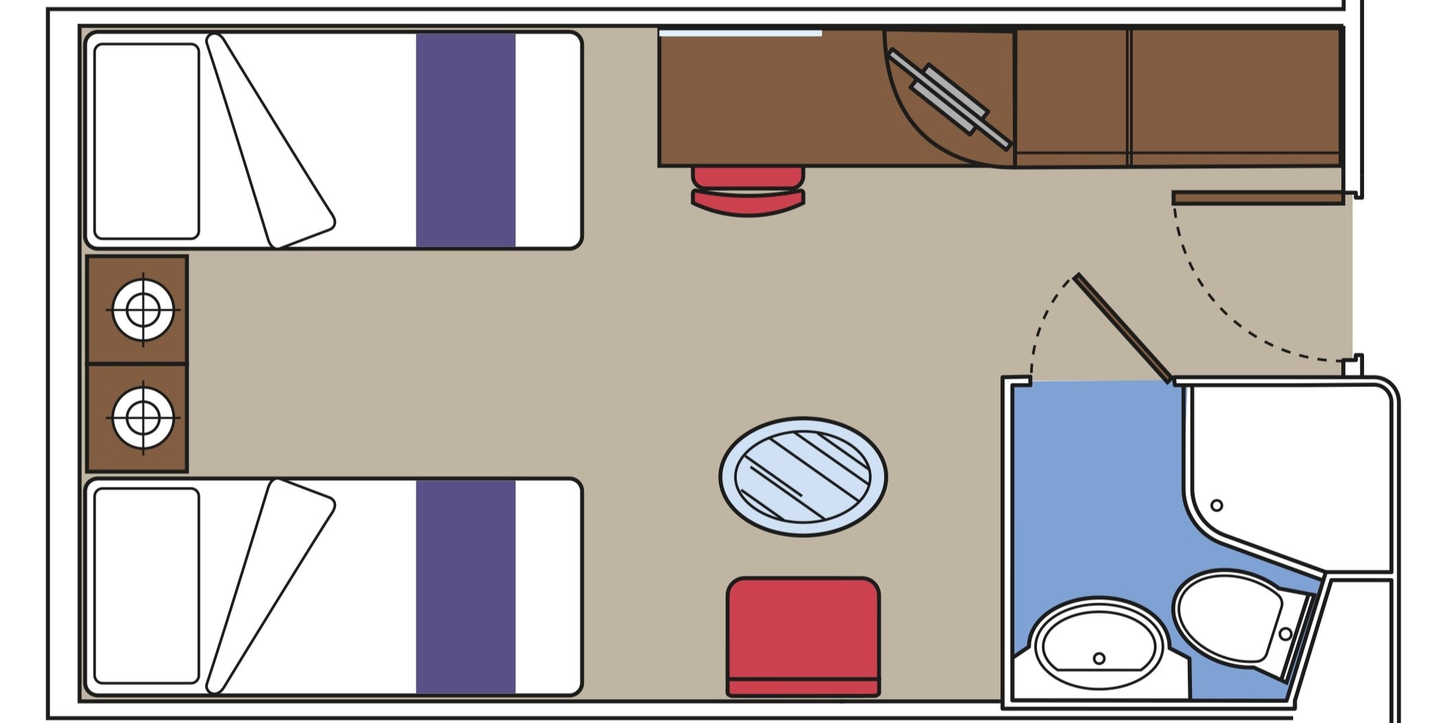 MSC抒情號(MSC LIRICA)內艙房以高 CP 值著稱,是想專注享受郵輪設施與行程旅客的理想選擇。房內設計簡約現代,空間規劃完善,配備舒適雙人床、獨立衛浴、電視、保險箱與充足收納空間,提供安靜放鬆的休息環境。白天可盡情體驗多元餐飲、劇院表演與娛樂設施,夜晚回到內艙享受穩定寧靜的睡眠,是精打細算又不減品質的郵輪住宿首選。