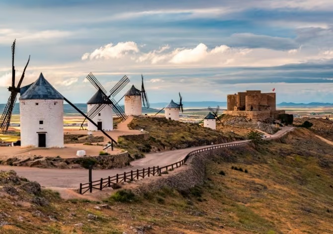 藍天襯托純白村落,古老風車整齊矗立山丘之上,宛如走入《唐吉訶德》的經典場景。石板小路蜿蜒,洋溢純樸鄉村風情與文學浪漫氣息。