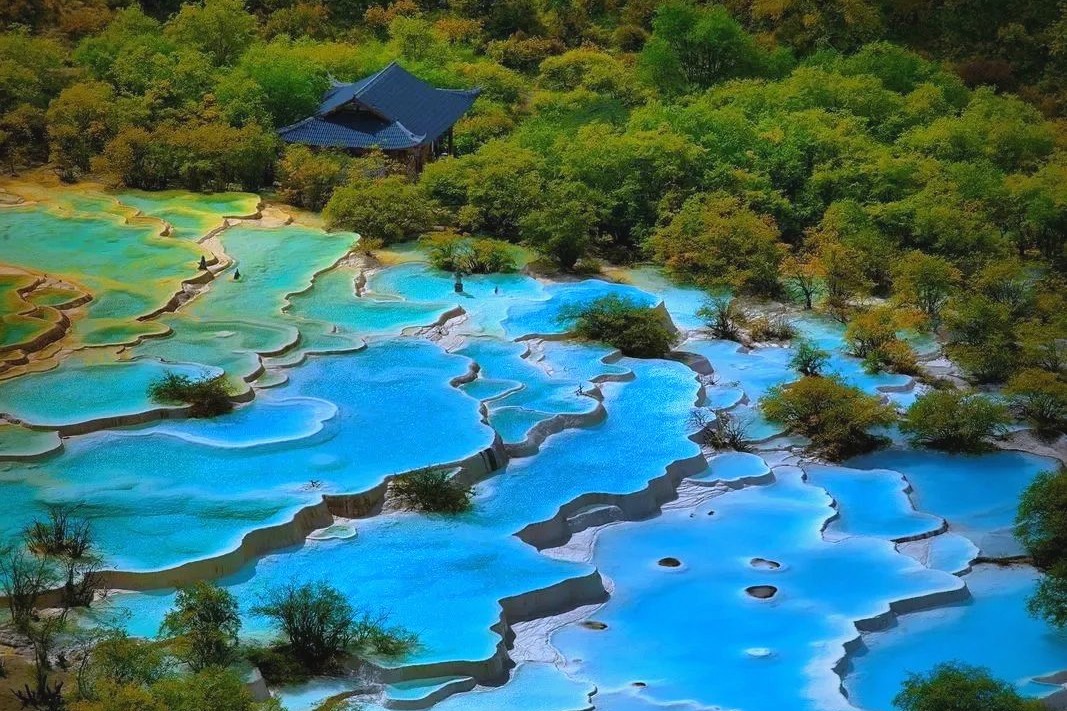 搭乘上行纜車至望龍坪,沿途欣賞美景直至黃龍溝最精華的景點--五彩池,而後徒步下山遊覽爭豔池、金沙鋪地。