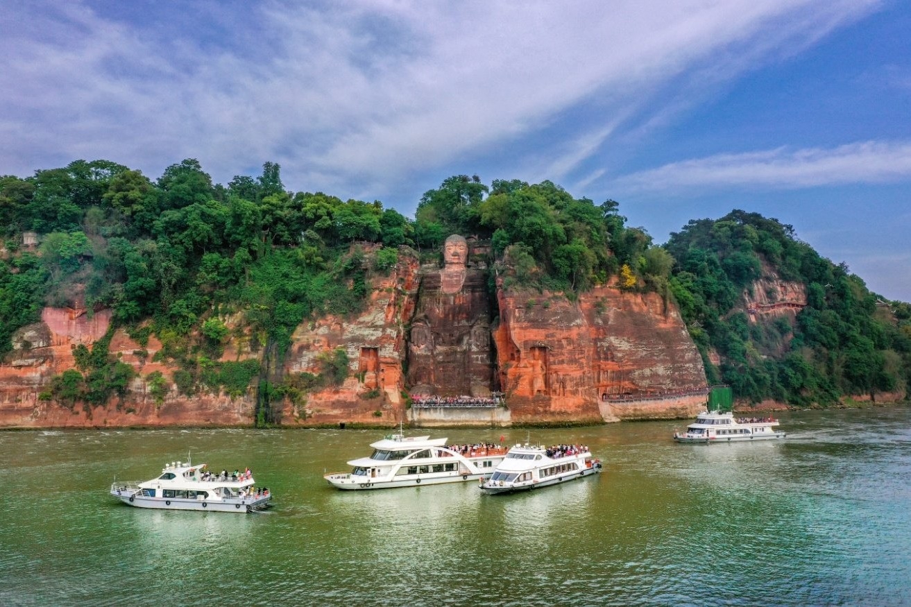 樂山大佛是世界現存最大的摩崖石刻彌勒佛坐像,坐落於四川省樂山市岷江、青衣江、大渡河三江交匯處,通高71米,頭與山齊,足踏江濤,歷經唐代開元元年(713年)至貞元十九年(803年)共90年鑿刻完成。