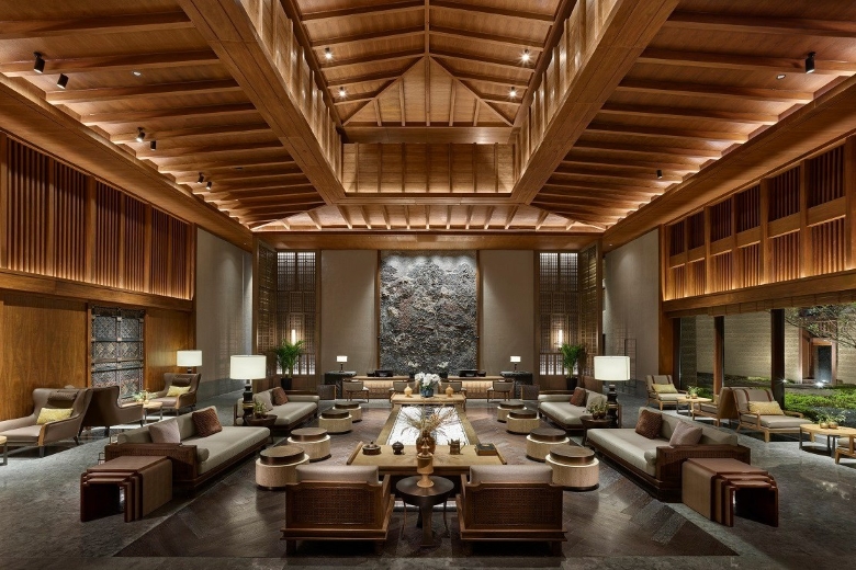 酒店坐落於峨眉山景區入口處,步行5分鐘可達「天下名山」牌坊。鄰峨秀湖,基礎房型均為50平方米起跳,極簡風格搭配全景落地窗,可私享湖面晨霧與星空夜景。