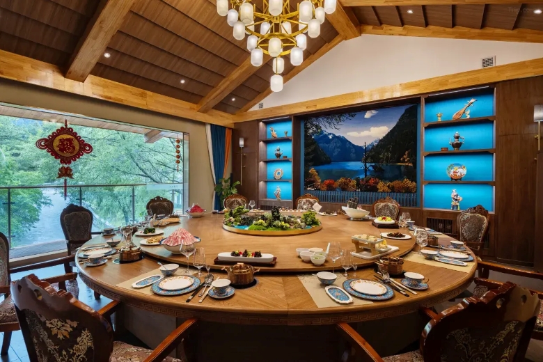 正宗川味、傳統中式、日系菜品應有盡有。餐廳位於酒店一樓,座位寬敞且融入藏式木雕元素,落地窗外可眺望中查村山景與藏寨風光,營造自然與人文交融的用餐環境。