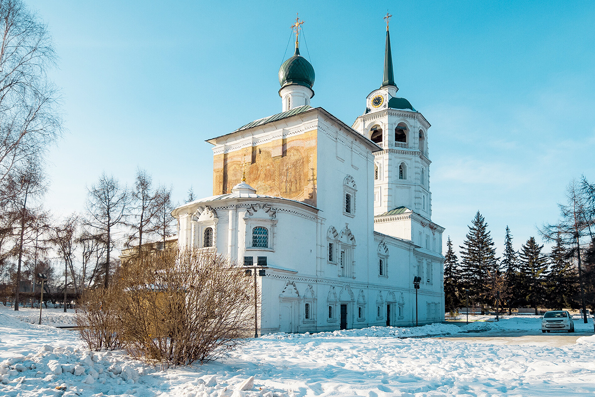 伊爾庫次克最古老的石造東正教堂之一,始建於1706年,融合俄羅斯巴洛克與西伯利亞在地風格。外觀以白牆與紅色裝飾相襯,立面浮雕精緻,展現宗教藝術之