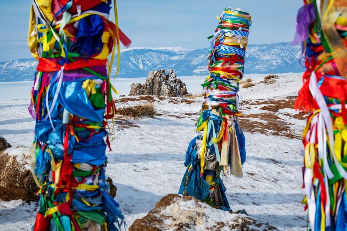 薩滿山與薩滿石位於奧利洪島庫日爾村附近,是貝加爾湖最具代表性的聖地。薩滿石峭立湖畔,被視為薩滿教通往靈界的入口,自古以來是祭祀與祈福之所。木樁上綁滿彩色祈願布條,隨風飄揚,象徵祈求幸福與守護。此地結合自然奇景與神秘信仰,成為奧利洪島最著名的地標之一。