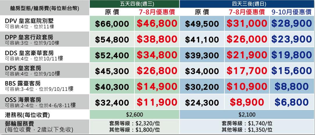 ■艙房價格及所有優惠方案以新台幣收費,僅適用於持中華民國護照者。