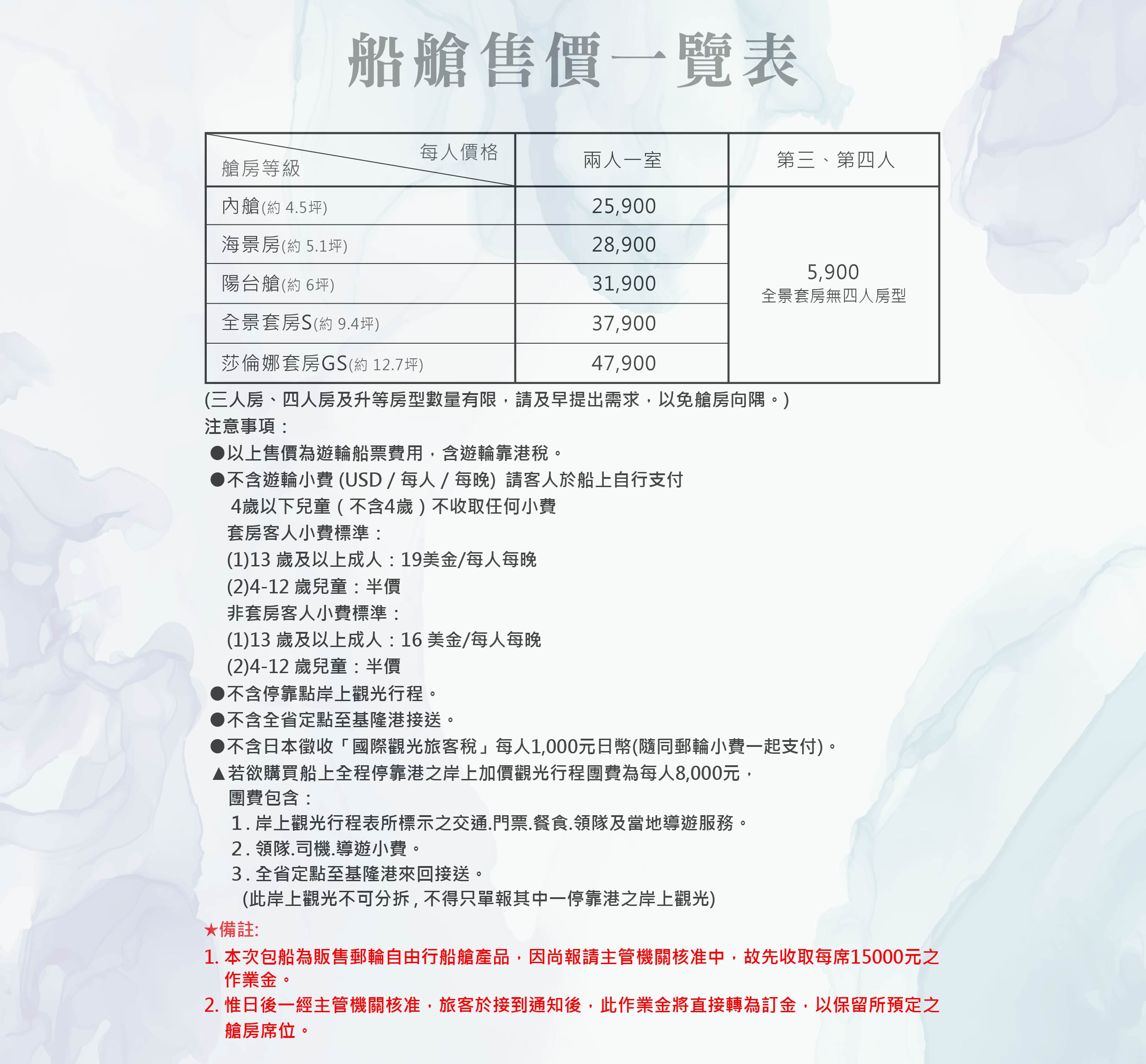 ●不含日本徵收「國際觀光旅客稅」每人1,000元日幣(隨同郵輪小費一起支付)。